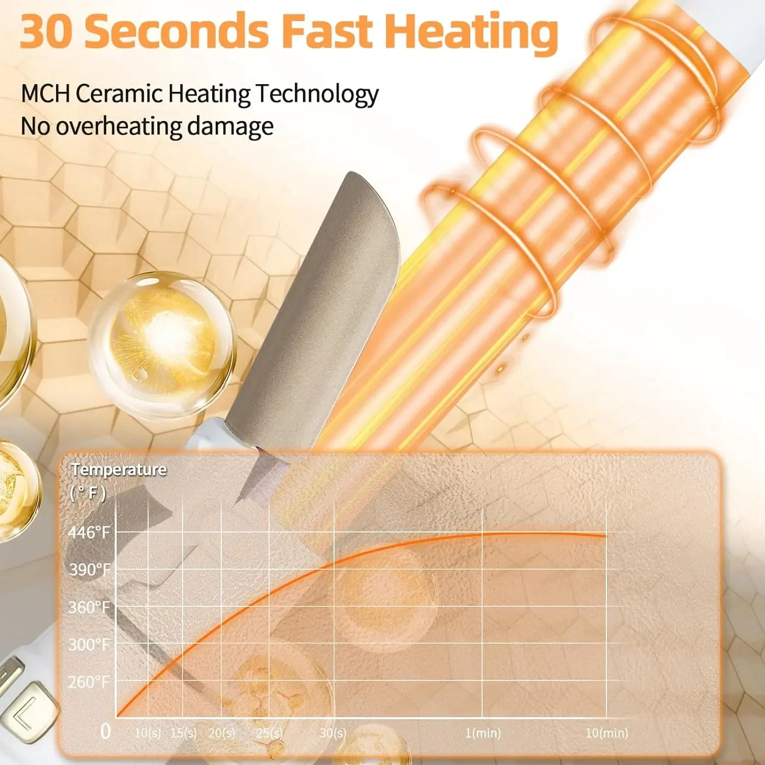 Experience the new automatic rotating curling iron and create natural big wavy curls easily. It adopts advanced rotating design, 45W powerful motor, and is suitable for 110-240V wide voltage worldwide. The curling iron is designed for big curls and can be used easily on wet or dry hair. The ceramic glaze heating tube protects your hair from damage and keeps your hair healthy and shiny. With LCD display, the temperature can be adjusted from 100°C to 230°C. The default power-on temperature is 180°C, and the 2-meter long 360-degree rotating power cord is easy to operate.