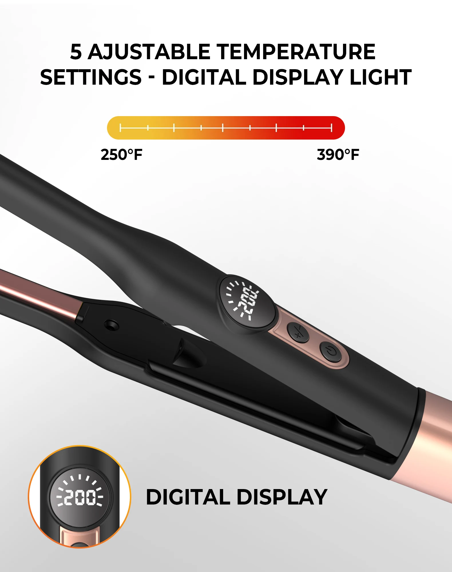 【Adjustable Temperature】-Mini small flat iron with adjustable temperature ranged from 210°F to 420°F that you could choose a proper temperature for your hair type. The temperature button is on top of the on/off button, the temperature would flash when the pencil flat iron is heating up. Press temper button and on/off button at the same time to convert the temper unit °C or °F. Digital LCD display panel shows the real-time temperature you adjust, avoiding too higher temp damage you hair