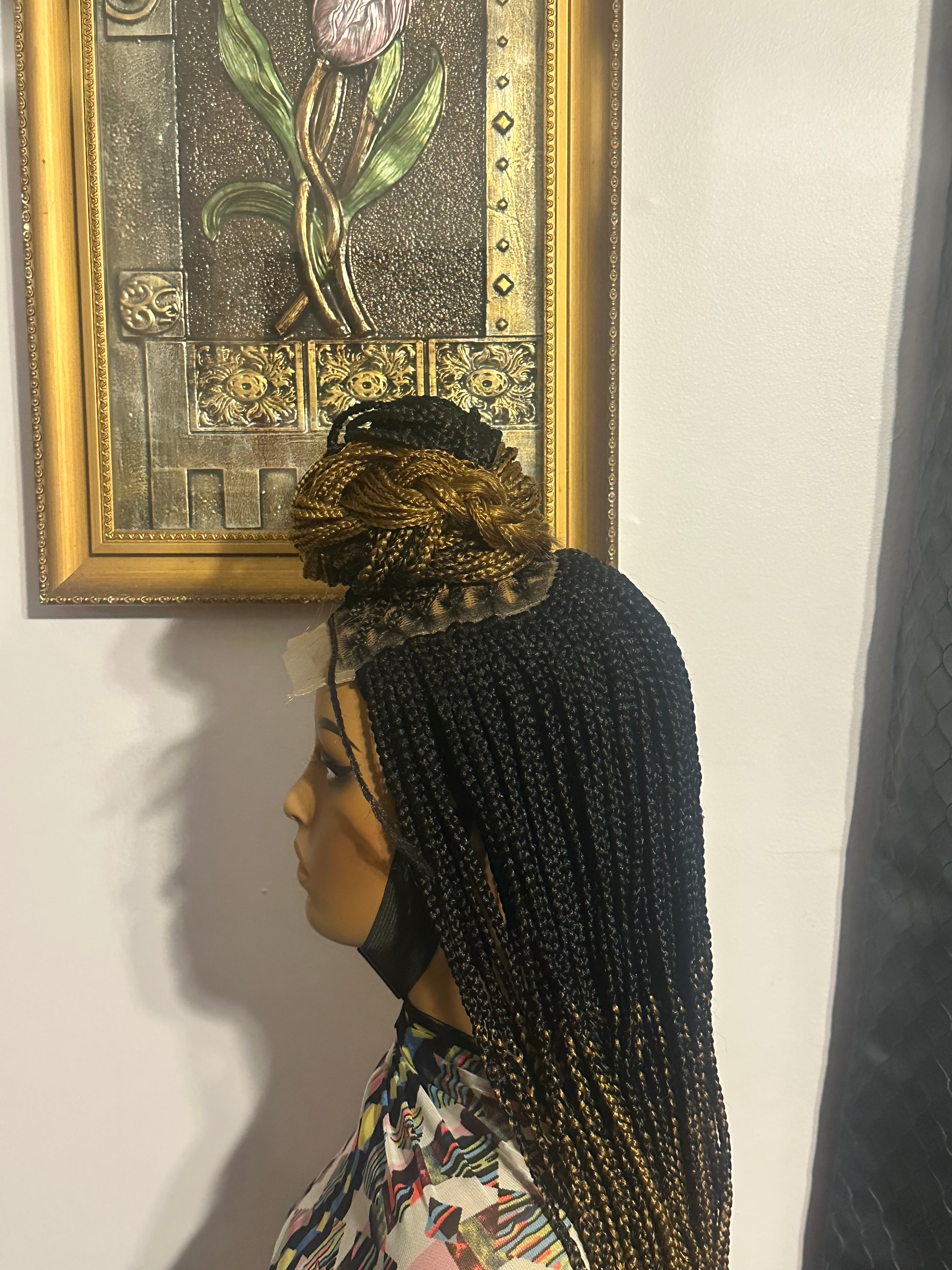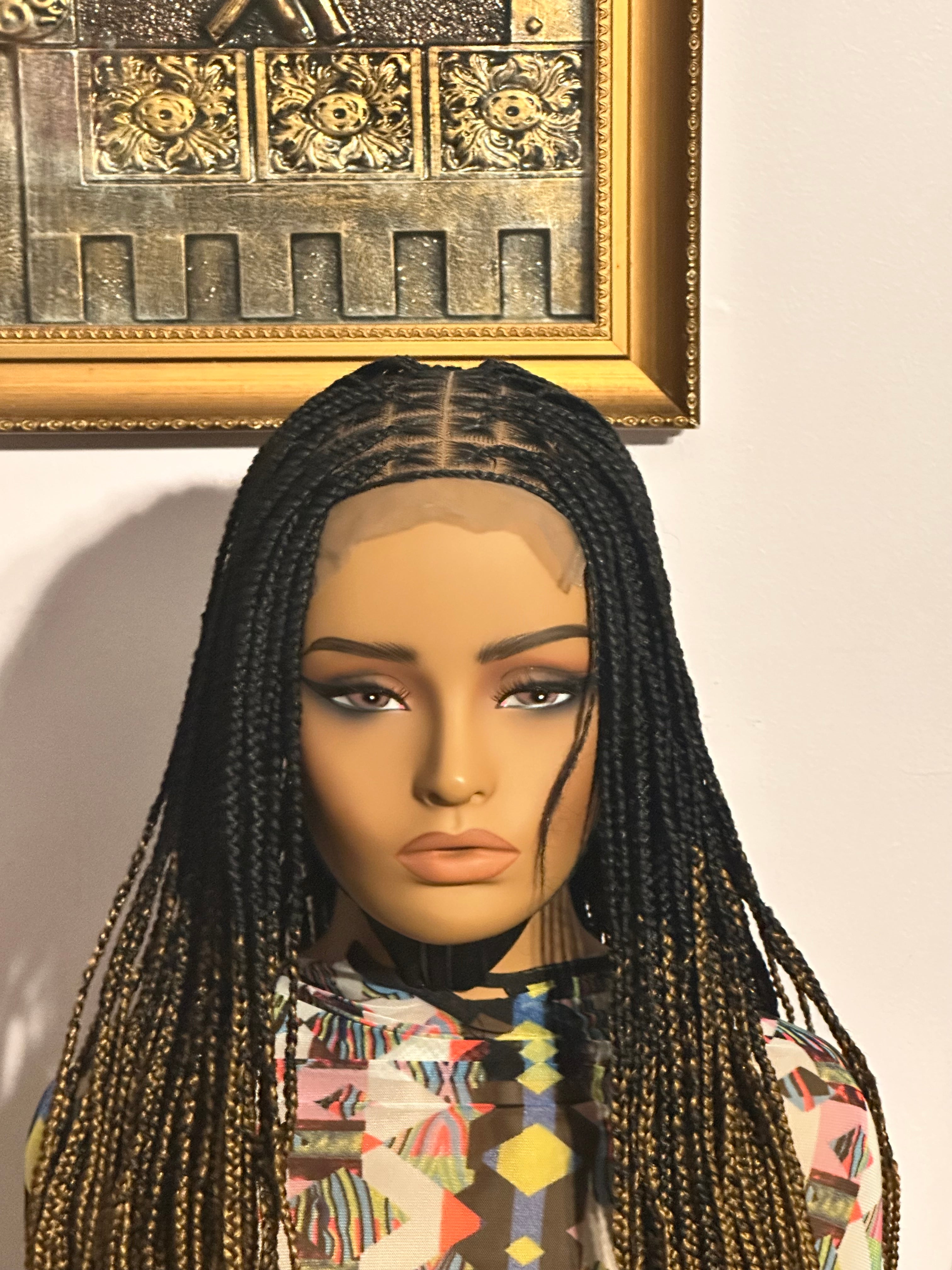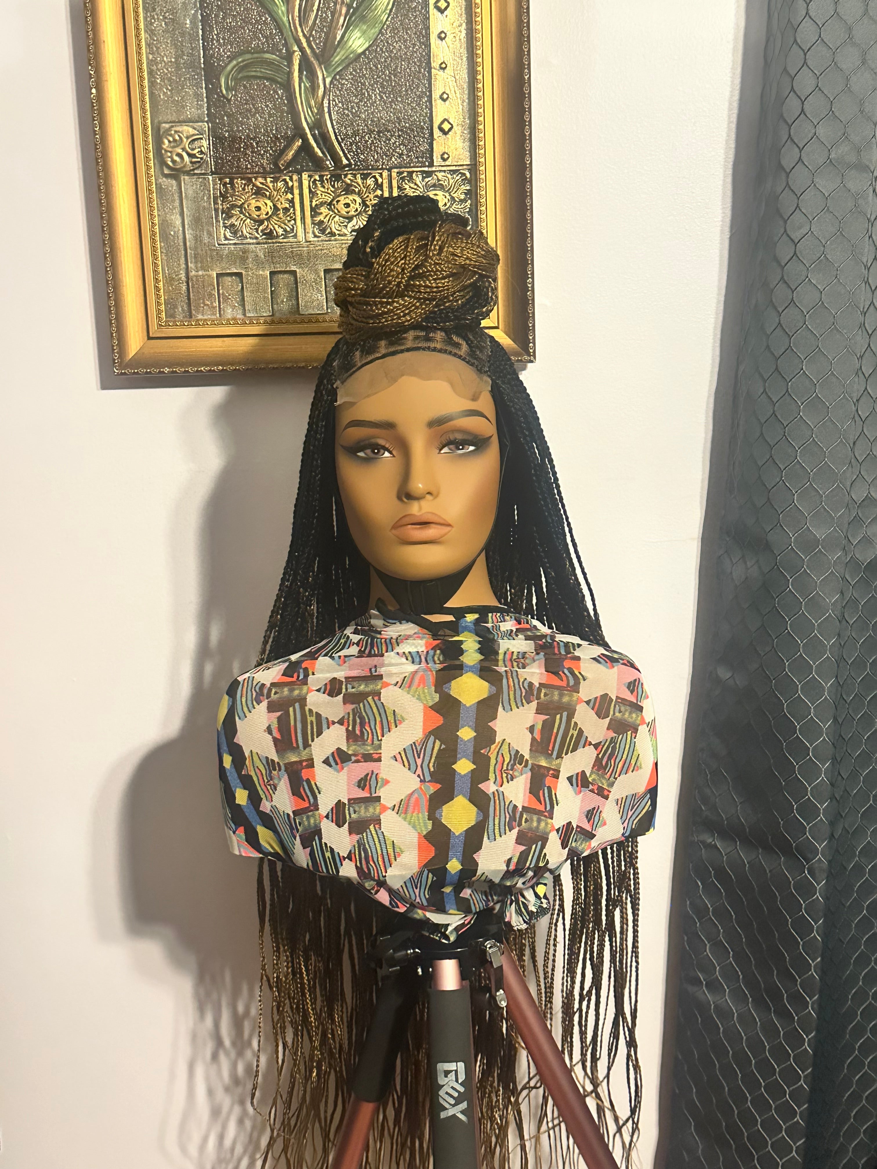 This Knotless Box Braid Lace Wig features a 4x4 lace design, allowing for a natural and seamless look. The two toned black and blonde color offers versatile styling options. With a 1 1/2 inch adjustable elastic band, this 34 inch wig is both comfortable and secure. Transform your look with this expertly crafted, high-quality wig.