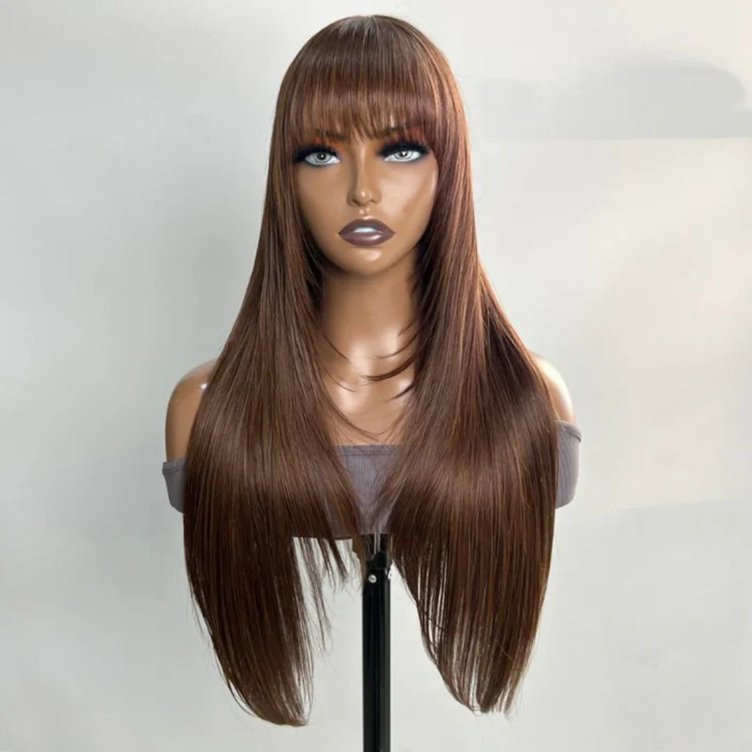 Chocolate Brown Layered Straight Wigs with Bangs Layered Cut 3X1 Lace Glueless Wig 4# Brown Color 180% Density For Daily Party