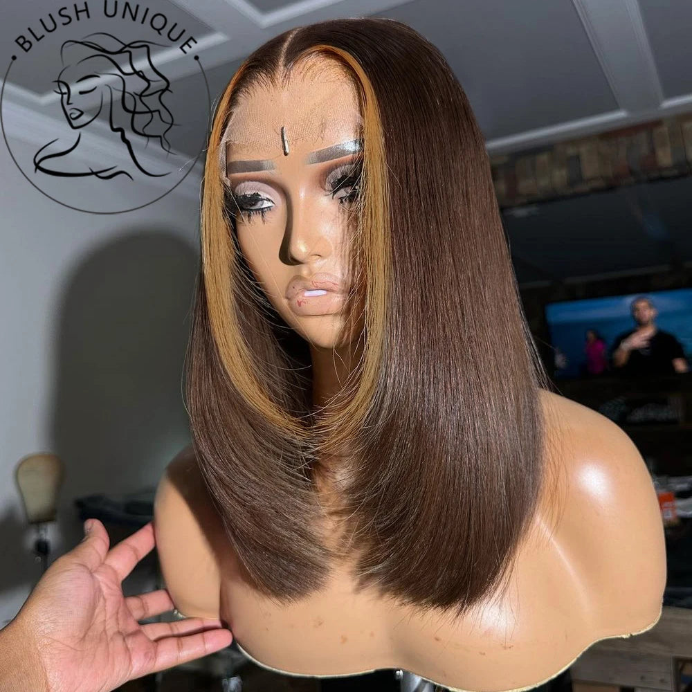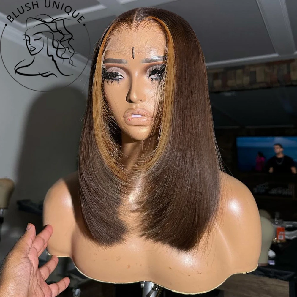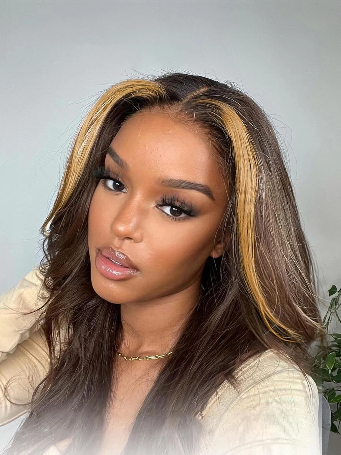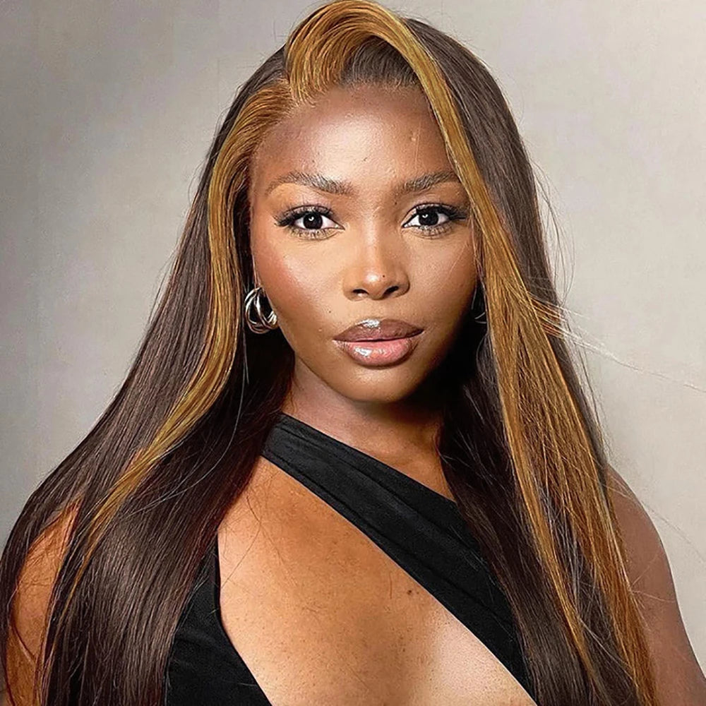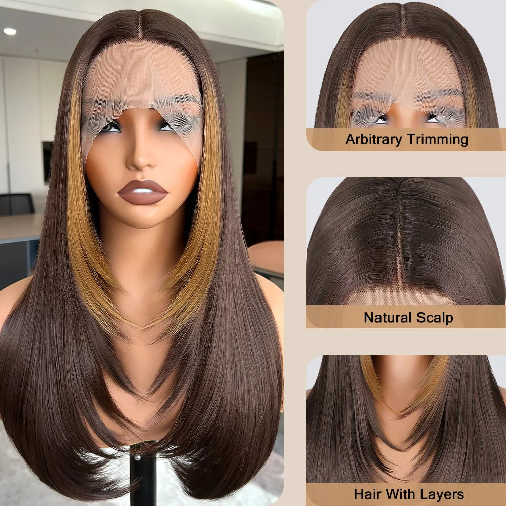 Chocolate Brown with Blonde Layered Straight Lace Front Wig Highlight Skunk Stripe Layered Cut Lace Wigs Synthetic Glueless Wig