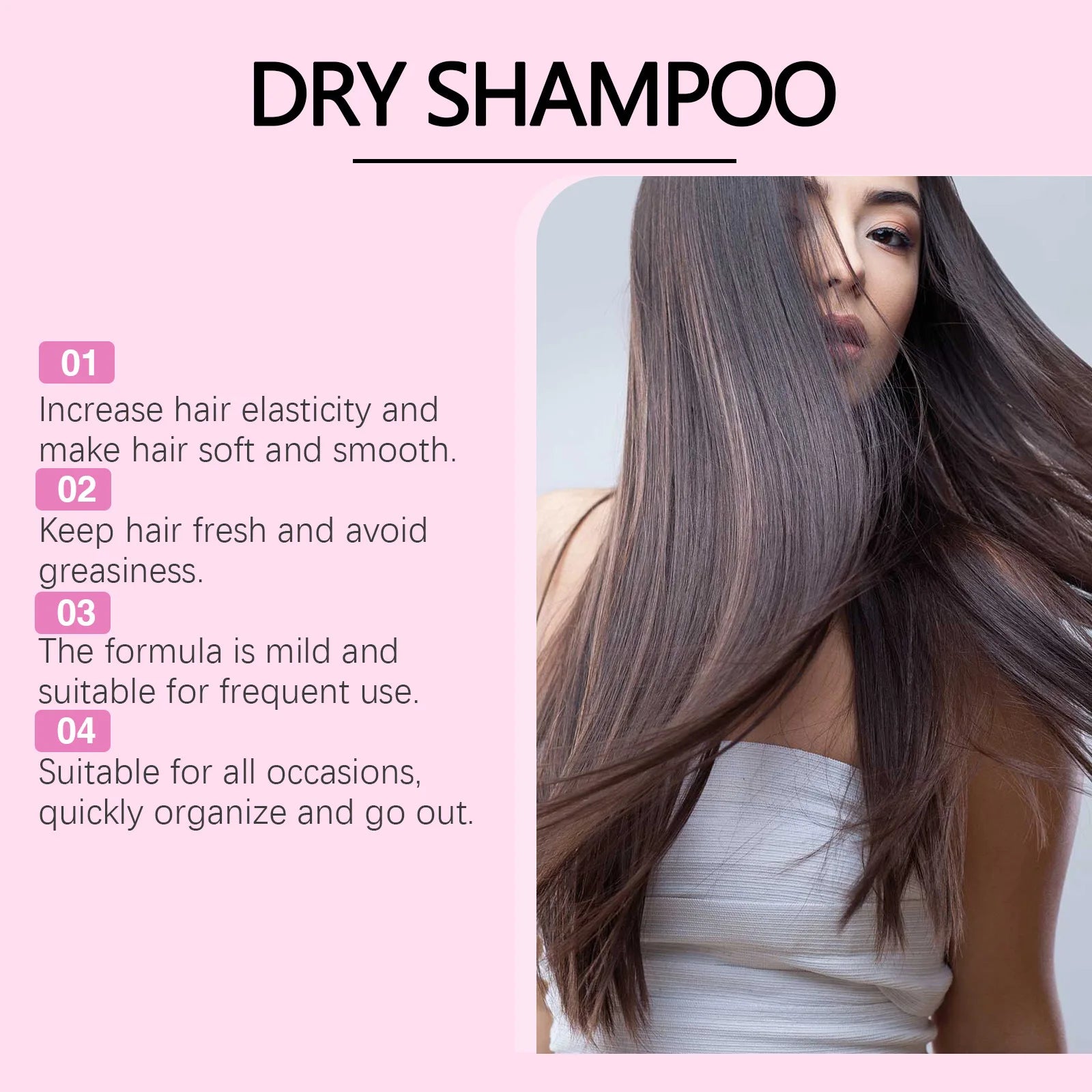 No need for washing with water, it can be used anytime and anywhere. When there's no time to wash hair in a busy morning, or when the hair is greasy after traveling or exercising outdoors, simply take out the dry shampoo spray and operate it a few times to quickly solve the problem of greasy hair, saving time and energy and meeting people's needs for a fresh - looking hairstyle in various scenarios.