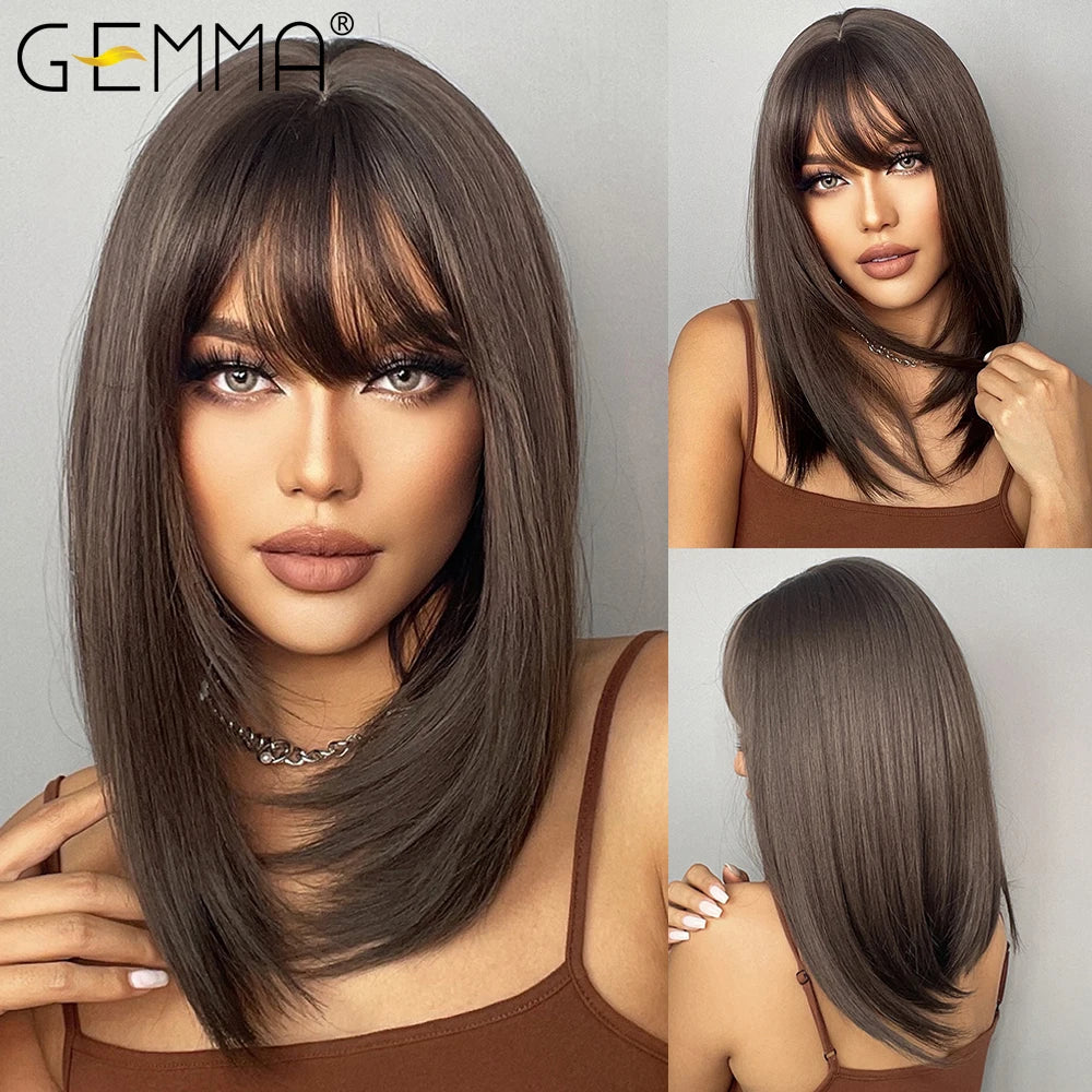 GEMMA Dark Brown BoBo Synthetic Wig with Bangs Shoulder Length Straight Wig for Women Cosplay Daily Hair Wig Heat Resistant Fibre